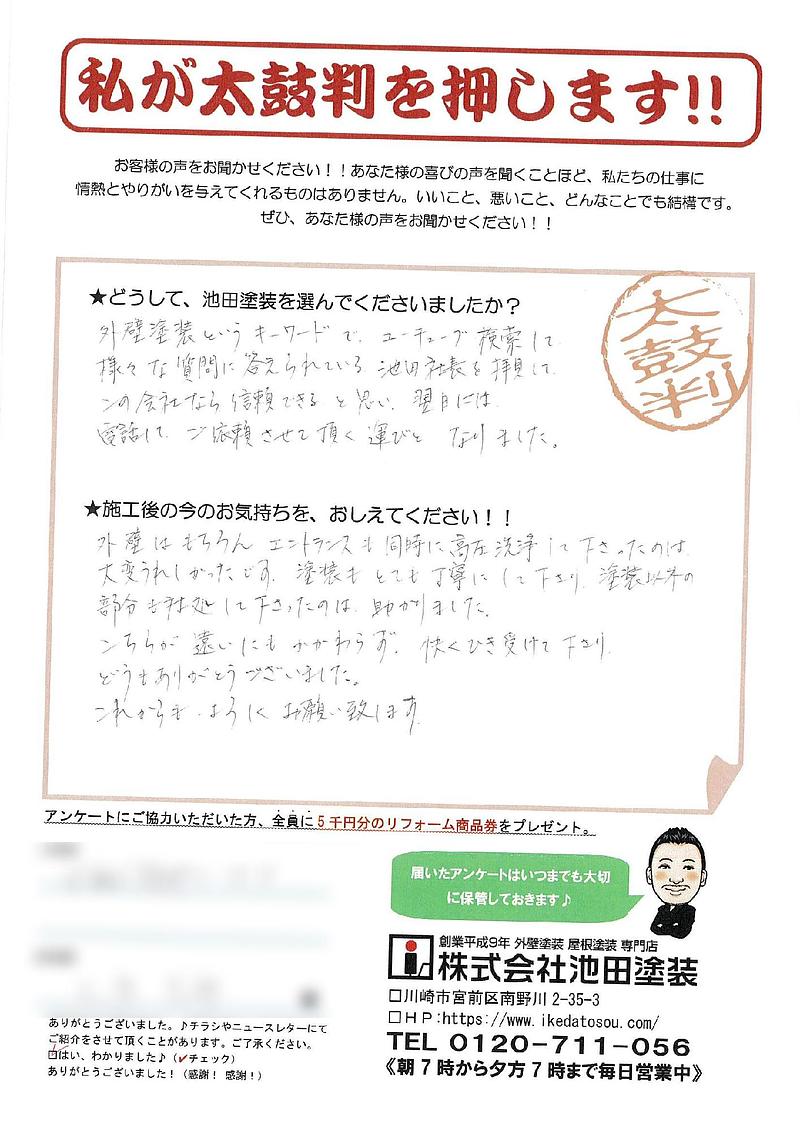 ★どうして、池田塗装を選んでくださいましたか?外壁塗装というキーワードで検索して様々な質問に答えられている池田社長を拝見してこの会社なら信頼できると思い翌日には電話してご依頼させて頂く運びとなりました。★施工後の今のお気持ちを、おしえてください!!外壁はもちろんエントランスも同時に高圧洗浄して下さったのは大変うれしかったです。塗装もとても丁寧にして下さり、塗装以外の部分も対処して下さったのは、助かりました。こちらが遠いにもかかわらず、快くひき受けて下さりどうもありがとうございました。これからもよろしくお願い致します。