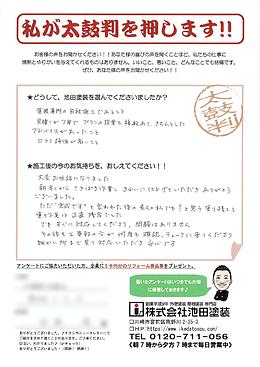 ★どうして、池田塗装を選んでくださいましたか?塗装専門の自社施工であること見積りが丁寧でプランの提案も複数あり、きちんとアドバイスがあったこと口コミ評価が高いこと★施工後の今のお気持ちを、おしえてください!!大変お世話になりました朝早くからてきぱき作業しきれいに仕上げていただきありがとうございました。ただ"完成です"と言われた後の素人の私でも?と思う塗り残しと塗り不足は正直残念でしたでも、すぐに対応してくださり、問題はありませんその後も工事部の方が何度も確認、チェックに来てくださり細かい所まで見て対応いただき安心です