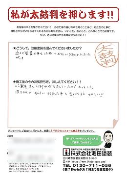 ★どうして、池田塗装を選んでくださいましたか?近くで塗装工事をした時にポストにタオルが入っていたので。★施工後の今のお気持ちを、おしえてください!!ここ数年、早くしなければと思っていたのでホッとした。回りの人にキレイになりましたネと言われるとうれしい!!・・・・・・・・・・・・・・