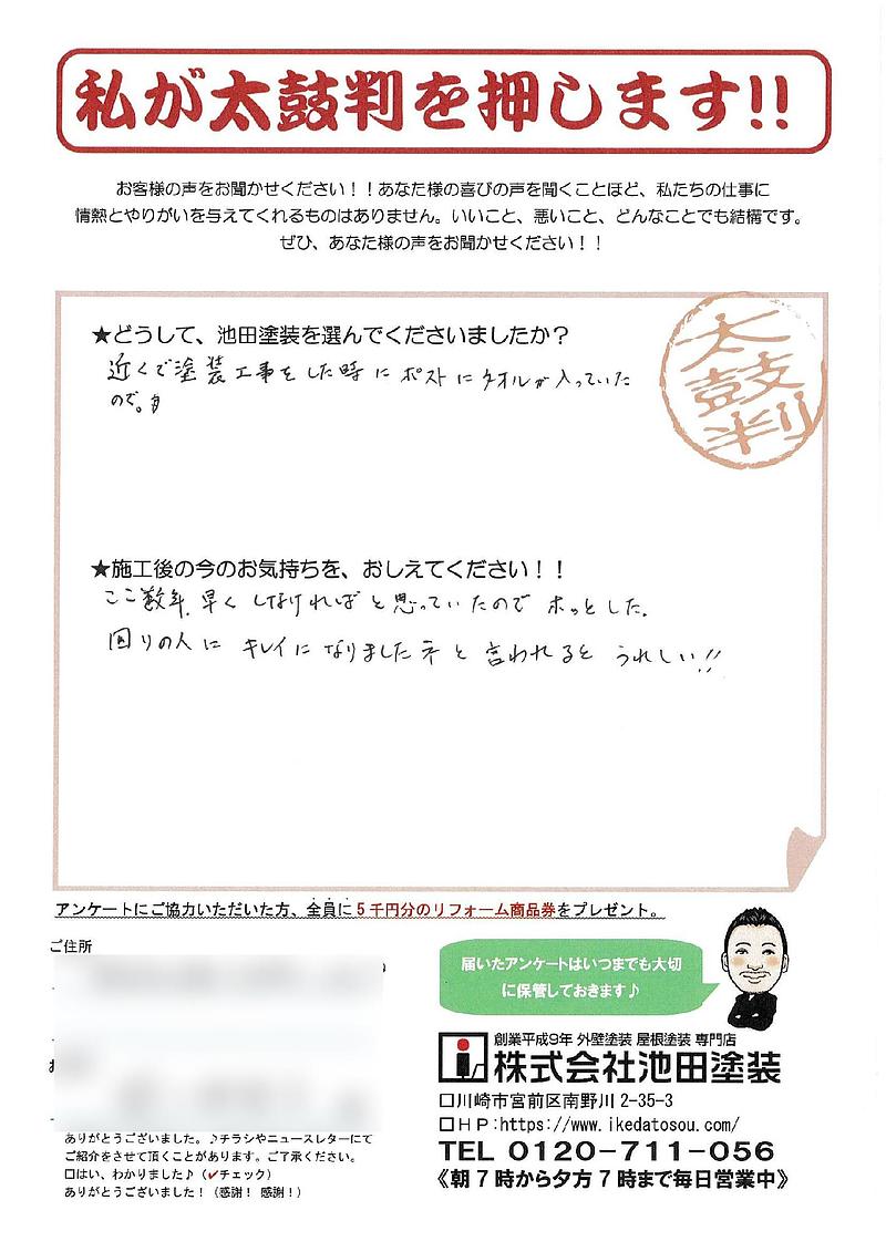 ★どうして、池田塗装を選んでくださいましたか?こちらの要望を傾聴し迅速に対応して頂き明確な見積り、説明等で安心してお願いできると感じた為。★施工後の今のお気持ちを、おしえてください!!寒い中、丁寧な施工、対応でキレイにして頂きありがとうございました。全てのスタッフの礼儀作法やお人柄にも敬服致しました。池田塗装さんにお願いして本当に良かったです!!