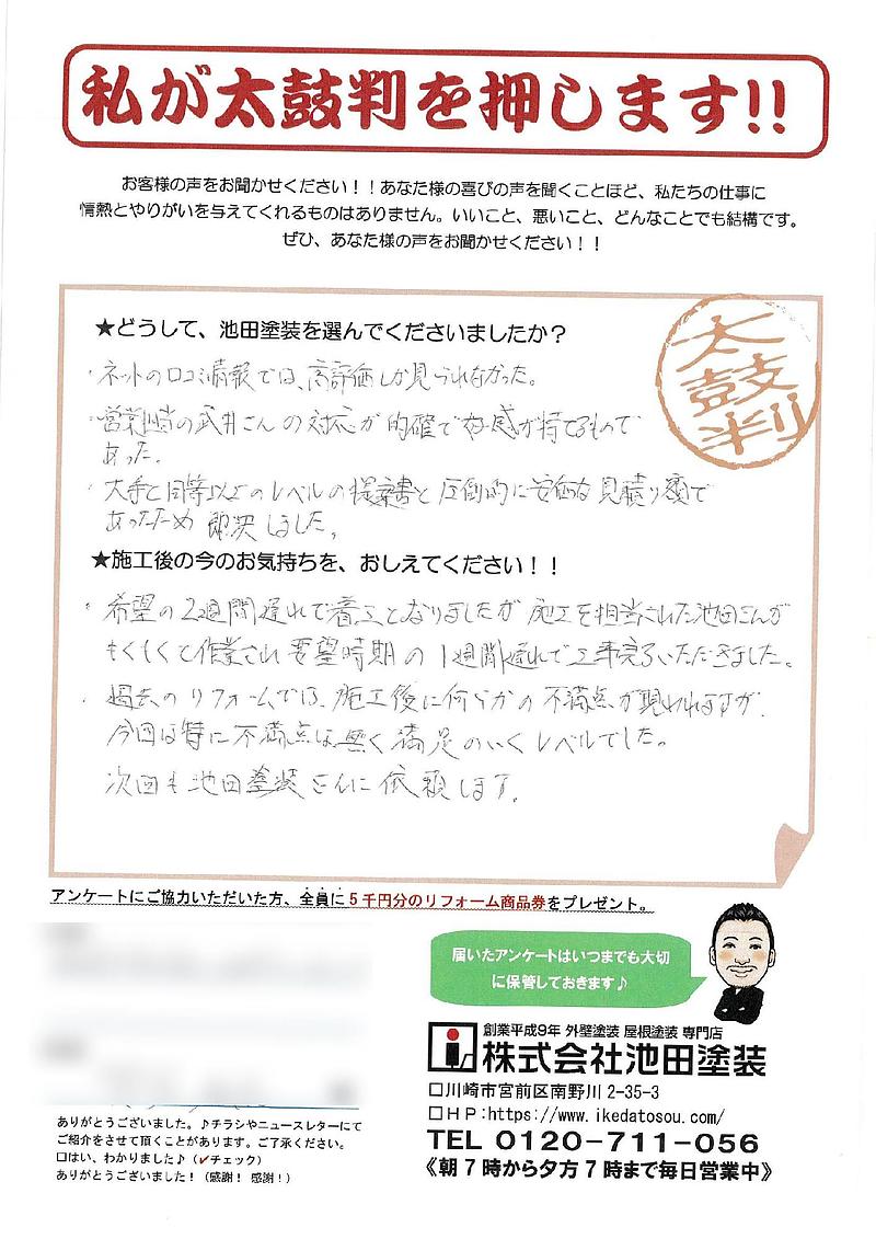 ★どうして、池田塗装を選んでくださいましたか?・ネットの口コミ情報では、高評価しか見られなかった。・営業担当の武井さんの対応が的確で好感が持てるものであった。・大手と同等以上のレベルの提案書と圧倒的に安価な見積もり額で あったため即決しました。★施工後の今のお気持ちを、おしえてください!!・希望の2週間遅れでちゃっこうとなりましたが、施工を担当された池田さんが もくもくと作業され要望時期の1週間遅れで工事完了いただきました。・過去のリフォームでは、施工後に何らかの不満点が現れますが、 今回は特に不満点は無く満足のいくレベルでした。 次回も池田塗装さんに依頼します。