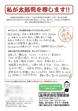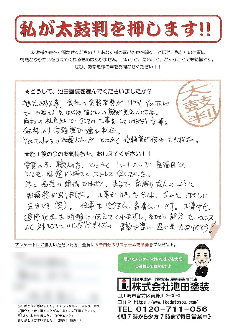 ★どうして、池田塗装を選んでくださいましたか?地元である事。会社の業務姿勢が、HPやYouTubeで社長さんをはじめ皆さんの顔が見えている事。自社の社員さんで全ての工事をしていただける事。価格より信頼度で選びました。YouTubeで社長さんが、とにかく信頼度が伝わってきました。★施工後の今のお気持ちを、おしえてください!!営業の方、職人の方、とにかくハートフルで真面目で、とても好感が持ててストレスなしでした。単に商売の関係ではなく、まるで家族や友人のように信頼感がありました。工事が終わった今は、ちょっと淋しい気分です(笑)。仕事はもちろん素晴らしいです。工事中も進捗状況を明確に伝えてくれますし、細かい部分もセンスよく対処していただけました。素敵で楽しい思い出をありがとう!
