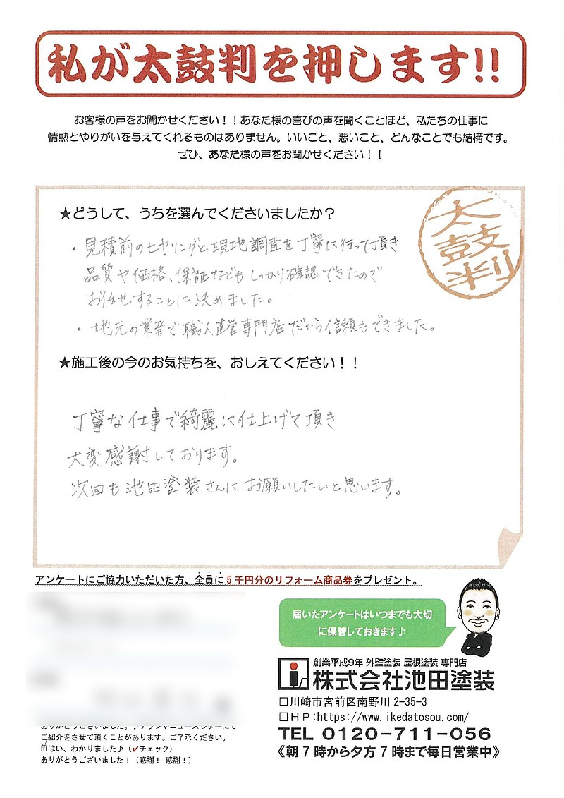 ★どうして、池田塗装を選んでくださいましたか?・見積前のヒヤリングと現地調査を丁寧に行って頂き 品質や価格、保証などもしっかり確認できたので お任せすることに決めました。・地元の業者で職人直営店だから信頼もできました。★施工後の今のお気持ちを、おしえてください!!丁寧な仕事で綺麗に仕上げて頂き大変感謝しております。次回も池田塗装さんにお願いしたいと思います。