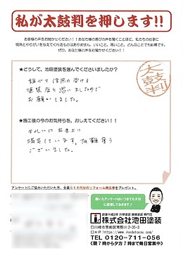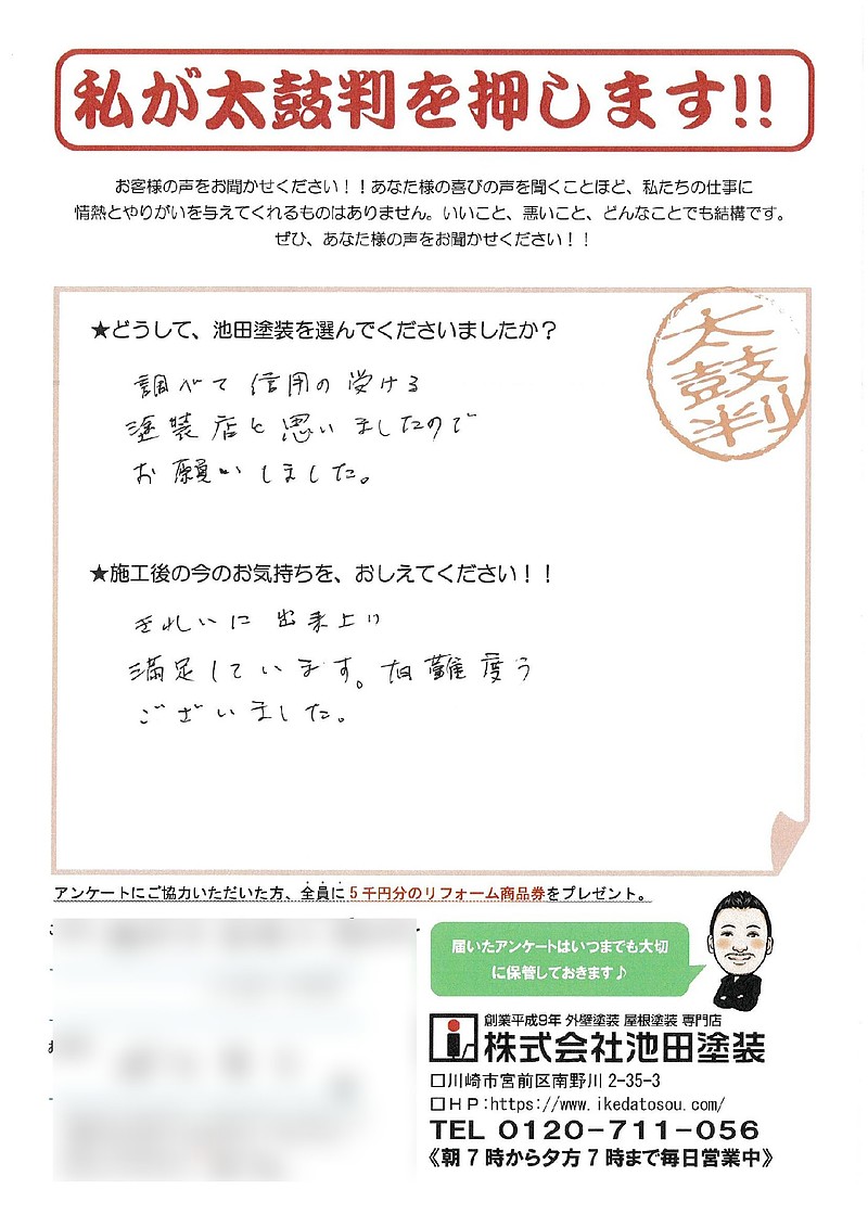★どうして、池田塗装を選んでくださいましたか?調べて信用のおける塗装店と思いましたのでお願いしました。★施工後の今のお気持ちを、おしえてください!!きれいに出来上り満足しています。有難度うございました。