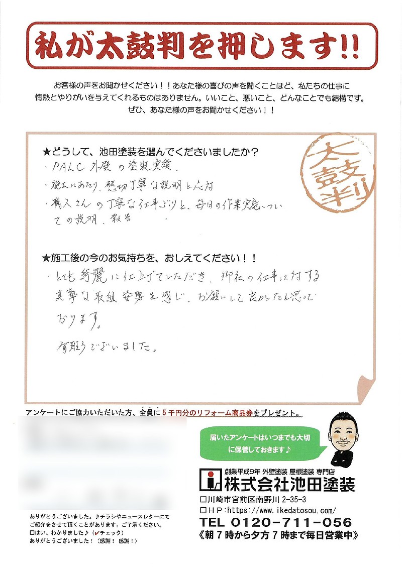 ★どうして池田塗装を選んでくださいましたか?・PALC外壁の塗装実績・施工にあたり、懇切丁寧な説明と応対・職人さんの丁寧な仕事ぶりと、毎日の作業実施についての説明、報告★施工後の今のお気持ちを、おしえてください!!とても綺麗に仕上げていただき、御社の仕事に対する真摯な取組姿勢を感じ、お願いして良かったと思っております。有難うございました。