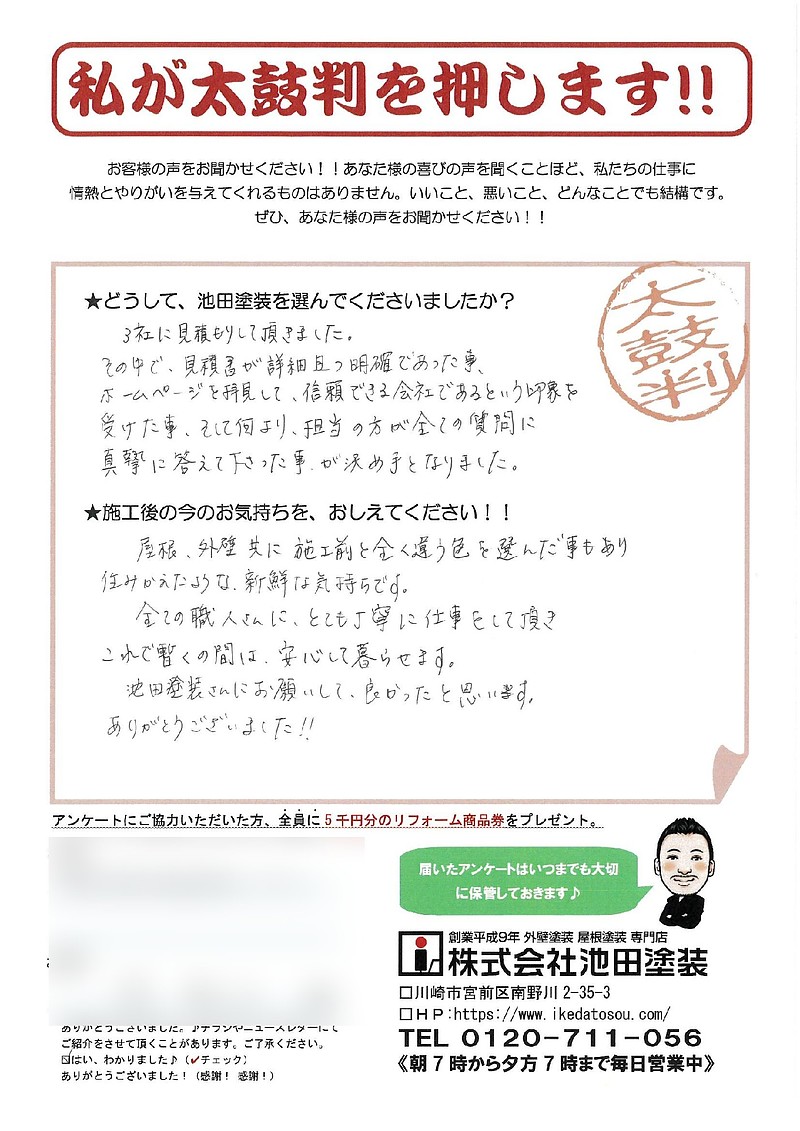 ★どうして、池田塗装を選んでくださいましたか?3社に見積もりして頂きました。その中で、見積書が詳細且つ明確であった事、ホームページを拝見して、信頼できる会社であるという印象を受けた事、そして何より、担当の方が全ての質問に真摯に答えて下さった事が決め手となりました。★施工後の今のお気持ちを、おしえてください!!屋根、外壁共に施工前と全く違う色を選んだ事もあり住みかえたような、新鮮な気持ちです。全ての職人さんに、とても丁寧に仕事をして頂きこれで暫くの間は、安心して暮らせます。池田塗装さんにお願いして、良かったと思います。ありがとうございました!!施工事例