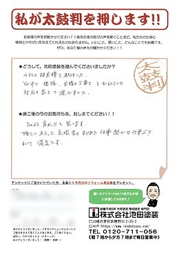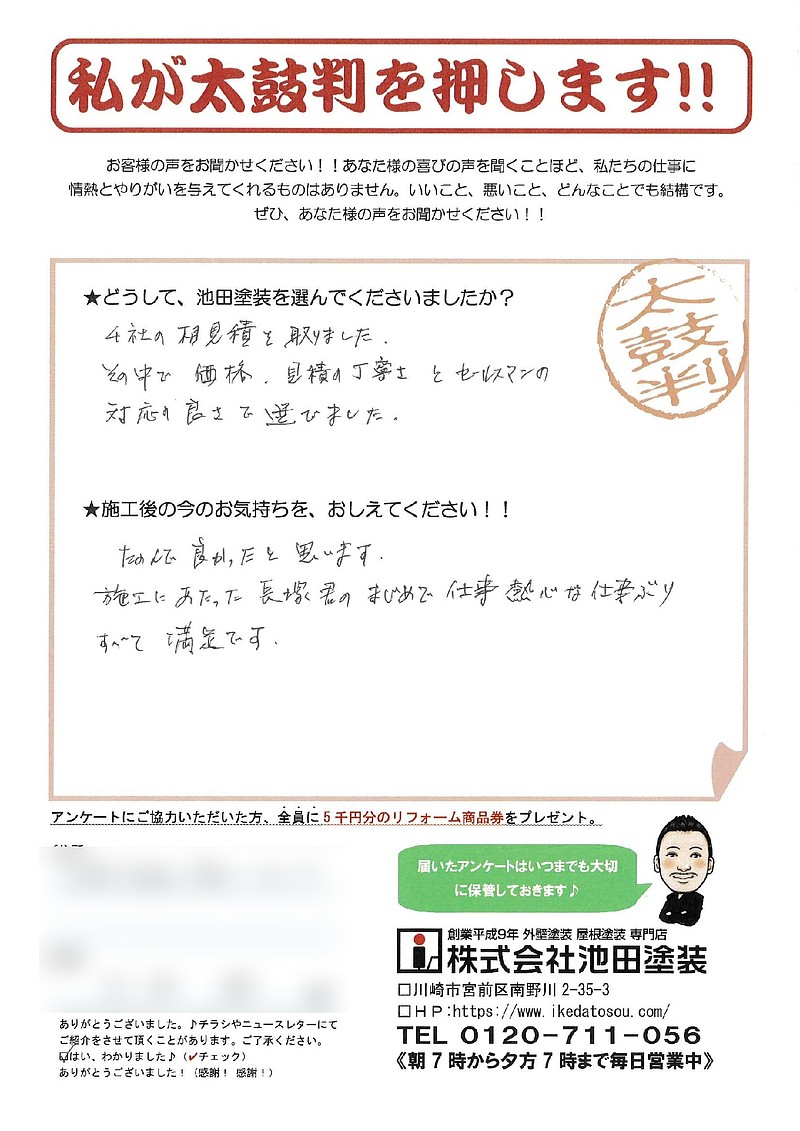 ★どうして、池田塗装を選んでくださいましたか?4社の相見積を取りました。その中で価格、見積の丁寧さとセールスマンの対応の良さで選びました。★施工後の今のお気持ちを、おしえてください!!たのんで良かったと思います。施工にあたった職人さんのまじめで仕事熱心な仕事ぶりすべて満足です。