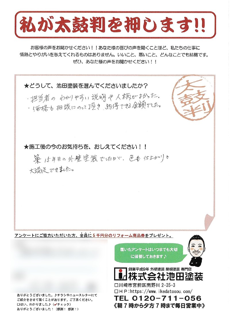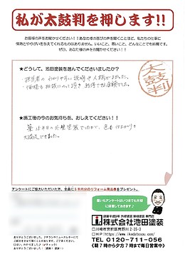 ★どうして、池田塗装を選んでくださいましたか?・担当者のわかりやすい説明や人柄がよかった。・価格も相談にのって頂き、納得できる金額でした。★施工後の今のお気持ちを、おしえてください!!築15年目の外壁塗装でしたが、色も仕上がりも大満足できました。