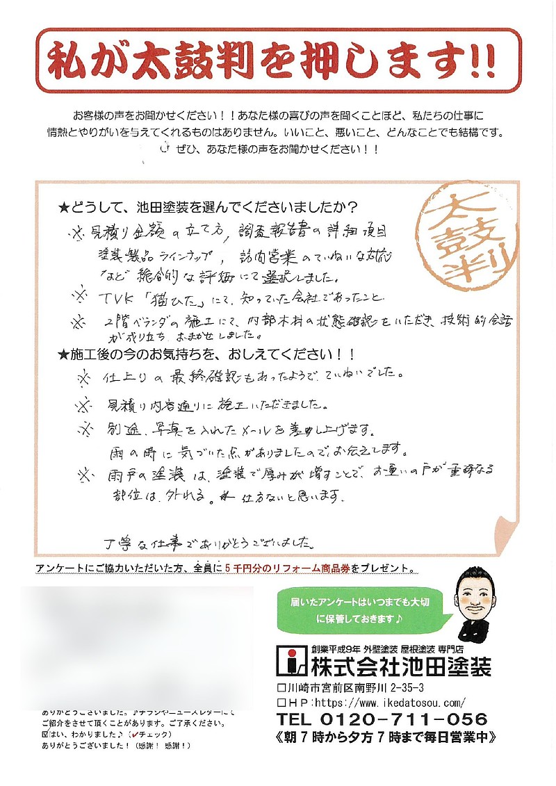 ★どうして池田塗装を選んでくださいましたか?★※見積り金額の立て方、調査報告書の詳細項目、塗装製品のラインナップ、訪問営業のていねいな対応など総合的な評価にて選択しました。※TVK「猫ひた」にて、知っていた会社であったこと。※2階ベランダの施工にて、内部木材の状態を確認いただき、技術的会話が成り立ち、おまかせしました。★施工後の今のお気持ちを、おしえてください!!★※仕上がりの最終確認もあったようで、ていねいでした。※見積り内容通りに施工いただきました。※別途、写真をいれたメールを差し上げます。雨の時に気づいた点がありましたので、お伝えします。※雨戸の塗装は塗装で厚みが増すことで、お互いの戸が重なる部位は外れる。←仕方ないと思います。丁寧な仕事でありがとうございました。
