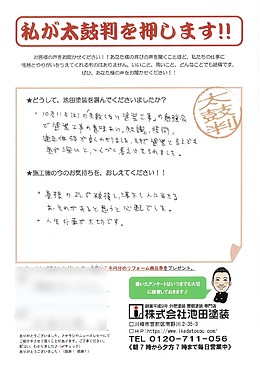 ★どうして、池田塗装を選らんでくださいましたか?・10月11日(土)の「失敗しない塗装工事」の勉強会 で塗装工事の意味あい、知識、技術、 適正価格が良くわかりました。たかが塗装と言えども 奥が深いと、つくづく考えさせられました。★施工後の今のお気持ちを、おしえてください!!・屋根の瓦が破損し、落下し人に当たる おそれがあると思うと心配でした。・人生と外面が大切です。