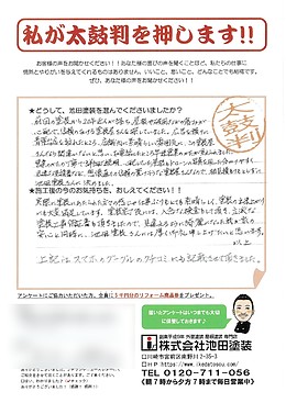 実際に塗装にあたられた方々の感じや仕事ぶりもとても素晴らしく、塗装の出来上がりにも大変満足しています。塗装完了後には、入念な検査もして頂き、立派な塗装工事保証書も頂きましたので、見違えるように綺麗になった我が家の安心と同時に池田塗装さんには厚い御礼申し上げたいと思います。