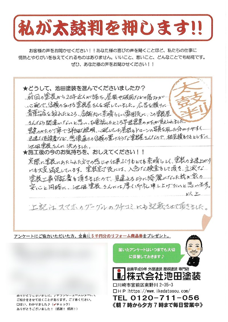 ★どうして池田塗装を選んでくださいましたか?前回の塗装から20年近くが経ち、屋根や破風などの痛みが心配で、信頼のおける塗装屋さんを探していました。広告を頼りに青葉台店を訪れたところ、店舗内に素晴らしい雰囲気に、この塗装屋さんなら間違いないと思い、お電話したところ早速営業の方が見えられました。営業のかたの丁寧で詳細な説明、心配していた屋根もドローンの写真を用いた分かりやすく迅速な見積り書など、想像通りの信頼の置けそうな塗装屋さんなので、相見積もりもとらずに池田塗装さんに決めました。★施工後の今のお気持ちを、おしえてください!!実際に塗装にあたられた方々の感じや仕事ぶりもとても素晴らしく、塗装の出来上がりにも大変満足しています。塗装完了後には、入念な検査もして頂き、立派な塗装工事保証書も頂きましたので、見違えるように綺麗になった我が家の安心と同時に池田塗装さんには厚い御礼申し上げたいと思います。