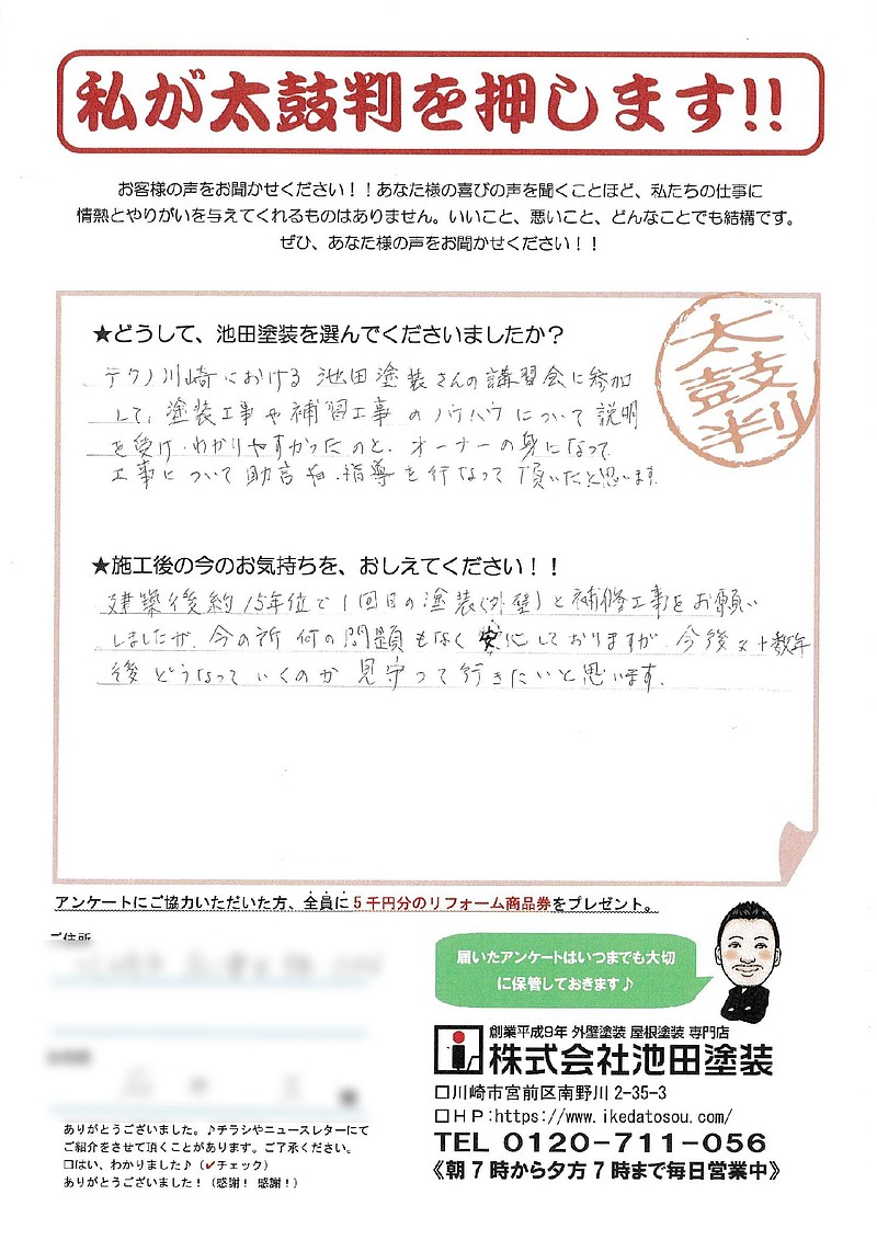 ☆どうして、池田塗装を選んでくださいましたか?テクノ川崎における池田塗装さんの講習会に参加して、塗装工事や補修工事のノウハウについて説明を受け、わかりやすかったのとオーナーの身になって工事について助言・指導を行って頂いたと思います。☆施工後の今のお気持ちを、おしえてください!!建築後約15年位で1回目の塗装(外壁)と補修工事をお願いしましたが、今の所何の問題もなく安心しておりますが今後又十数年後どうなっていくのか見守って行きたいと思います。