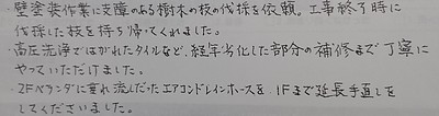 「・壁塗装作業に支障のある樹木の枝の伐採を依頼。工事終了時に伐採した枝を持ち帰ってくれました。
