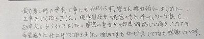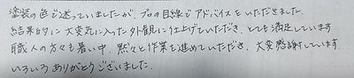 現場責任者の支持のもとチームワーク良く効率良くやられてました。塗装の色もその都度確認して頂き、こちらの希望通りに仕上げて頂きました。追加工事もサービスして頂き感謝しています。」