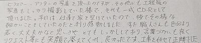「ビフォアー・アフターの写真をいただいたのですが、その他にも工程毎の写真もしっかり撮影していた様で、それも一式CD-Rとしていただけました。平日は、仕事で家を空けていたので、後でそのような細かいことをしていたのだと判り感動しました。また職人さんも自分より若く大丈夫かなと思いきや、とてもしっかりしており言葉づかいも良くリクエスト等にも笑顔で答えてくれ良かったです。仕事を任せて正解でした。」
