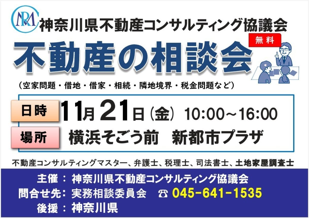 私も所属している神奈川県不動産コンサルティング協議会主催の2025年最後となる無料相談会が、来る11月21日(金)横浜そごうSOGO前 新都市プラザにて無料相談会開催されます!
