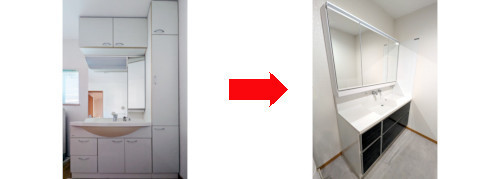 洗面化粧台の交換工事をさせていただきました。今回、採用されたタカラスタンダード ファミーユは、濡れるものと濡らしたくないものの2つのエリアで使い分けできるカウンター設計や、透明感と高級感のあるアクリル人造大理石の天板など、実用的かつスタイリッシュなデザインなので、使い勝手だけでなく空間もスッキリしたシンプルモダンなイメージにかわりました。