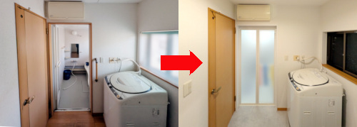 浴室と洗面化粧台の交換工事と一緒に洗面室の内装工事をさせていただきました。天井、壁、床を貼り換え、新しくなった洗面化粧台のスタイリッシュなデザインによくあうシンプルモダンなイメージにかわりました。