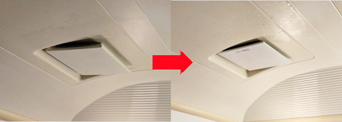 「浴室とトイレの換気扇から異音がする」とご相談を受け、換気扇の交換工事をさせていただきました。浴室は、既設の換気扇の後継機種に交換されたので、安心してこれまでと同様の操作でお使いいただけると思います。