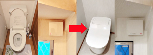 「タンクレスのトイレに交換して、室内に手すり設置し、内装もキレイにしたい。」というご依頼を受け工事をさせていただきました。トイレは、タンクレスで掃除が楽、節水効果が高い、省エネ性能に優れているPanasonicのアラウーノに交換、換気扇も静かで快適な換気を実現する東芝のパイプ用ファン 風量形に交換して内装も張替をされ、トイレ空間内が一新され、快適にお使いただけると思います。