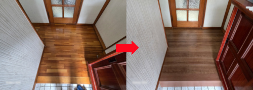 「トイレの入り口の床がぶかぶかしてるので一度見てほしい。」というご依頼を受け、現場調査の後、今の状態とお施主様のご要望から床の増し張りをご提案し、工事をさせていただきました。床材は、ものを落としても凹み傷がつきにくくお手入れも楽なPanasonic ベリティスフロアー ベースコートを選択されたので、キレイが長持ちで快適にお過ごしになれると思います。