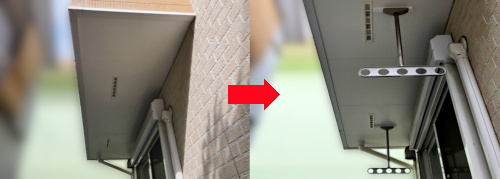 「早急にホスクリーンを取り付けたい。」とのご依頼で、現場調査後、最短で設置工事をさせていただきました。スマートなデザインなので、人目につきやすい軒天に設置してスッキリとした印象です。高さの調整も可能なので、使い勝手も良いと思います。
