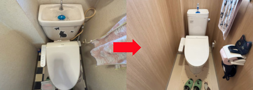 トイレをTOTO ピュアレストMRに交換し、内装も新しくされました。便器や洗浄便座の機能性や清掃性が、これまでお使いのものよりグンとアップし、空間のイメージもお施主様のお好みにされたので、快適な空間になりました。