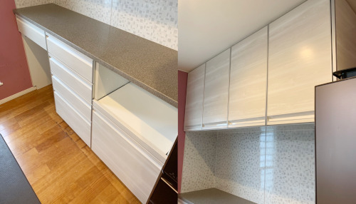 キッチンにカップボードを設置させていただきました。収納スペースが増えることで、食器や調理器具、食品のストックなどを効率的に収納でき、キッチン全体がスッキリと片付いて、使い勝手のよいキッチン空間になると思います。