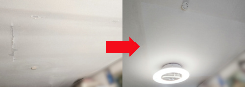「購入したシーリングファンライトを1Fの天井に自分で取り付けようとしたが、天井の耐荷重を超えているようで、ライトが落ちてきそうで自分ではできそうにない。天井を補強して取り付けて欲しい。」とのご依頼を受けて施工をさせていただきました。同時に電気配線工事をして引っ掛けローゼットも取り付けたので、お気に入りのシーリングファンライトを安心してご使用いただけると思います。