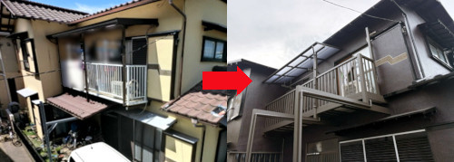 劣化の進んだベランダを撤去し、車の動線を意識して柱を設置し、バルコニーを新たに取り付けさせていただきました。これで、雨の日に車から家へ濡れることなく移動でき、耐久性も高くなったので安心快適にお使いいただけると思います。