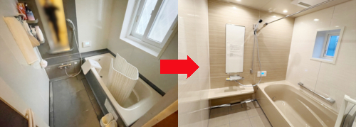 システムバスの交換工事をさせていただき、機能や清掃性がアップしました。また、入り口のドアを開閉の際にスペースをとらず、力を使わずに開け閉めができて、開け閉めの際の動作もその場に立ったままと最小限ですむ片引戸に変更、浴槽から楽に立ち上がりができる手摺をつけられたり、将来のことを見据えて安全安心で快適な浴室にリフォームされました。