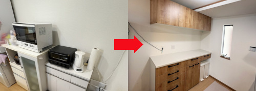 お施主様より、ネットでご購入予定のカップボードと吊り戸を1Fキッチンに取り付けてほしいとのご相談をいただきました。ご希望に合わせて、カップボードと吊り戸の取り付け工事に加え、キッチンまわりの使い勝手をより良くするためにコンセントの増設も行いました。設置後は、細々としたキッチン用品もスッキリと収納できるようになり、お施主様こだわりのカップボードと吊り戸が空間にしっくりと馴染んでいます。見た目も機能性も兼ね備えた、使いやすいキッチンに生まれ変わりました。