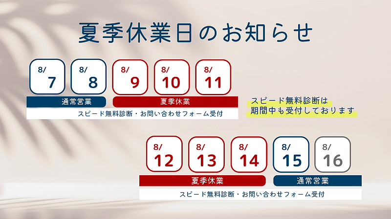 8/9(土)から8/14(木)まで、さがみ社会保険労務士法人は湘南平塚オフィス・横浜オフィスとも休業となります。