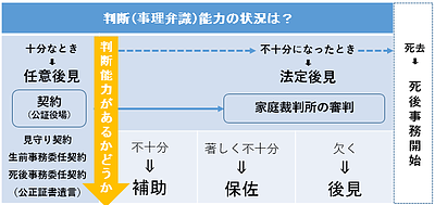 認知症等の理由で判断能力の不十分な方々は、不動産、預貯金などの財産を管理したり、身の回りの世話のために介護サービスや施設への入所に関する契約を結んだり、遺産分割の協議をしたりする必要があっても、自分でこれらのことをすることが難しい場合があります。また、自分に不利益な契約であってもよく判断ができずに契約を住むんでしまい、悪質商法の被害にあう恐れもあります。このような判断能力の不十分な方を保護し、支援するのが成年後見制度であり、大きく分けると2つの制度、「法定後見」と「任意後見」があります。