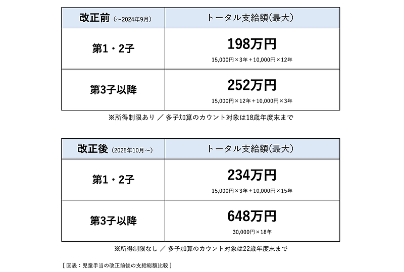 こうして見ると、第1・2子は198万円から234万円へ+36万円。そして第3子以降はなんと252万円から648万円へ、実に+約400万円の増額です。トータルで見ると「これほど大きな支援だったのか」と驚かれる方も多いのではないでしょうか。
