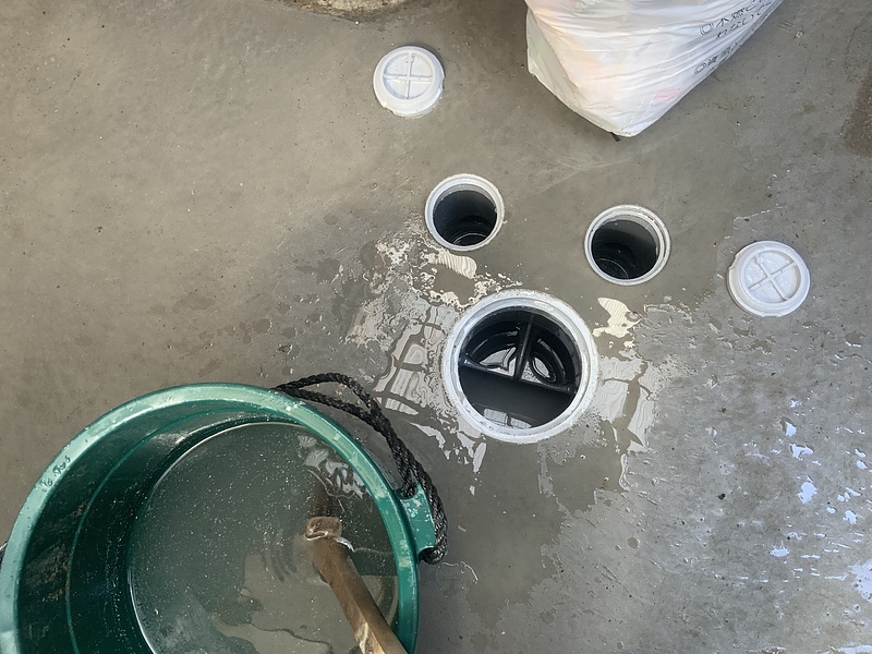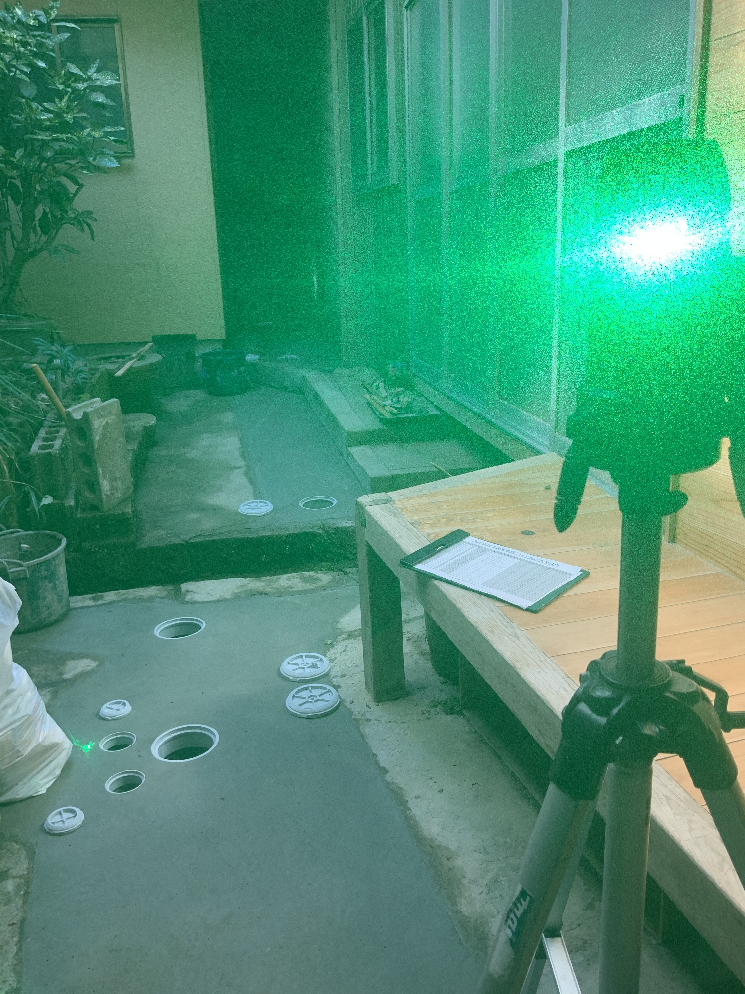 浄化槽工事の検査は深さは測らなので、ここまでする必要はないんやけど、下水道の検査のために作ったエクセルの計算式に当てはめるために、出来上がってから、距離、点検口のフタの高さ、排水管底の高さを測量するのがグリプロ流( ˘ω˘ )v