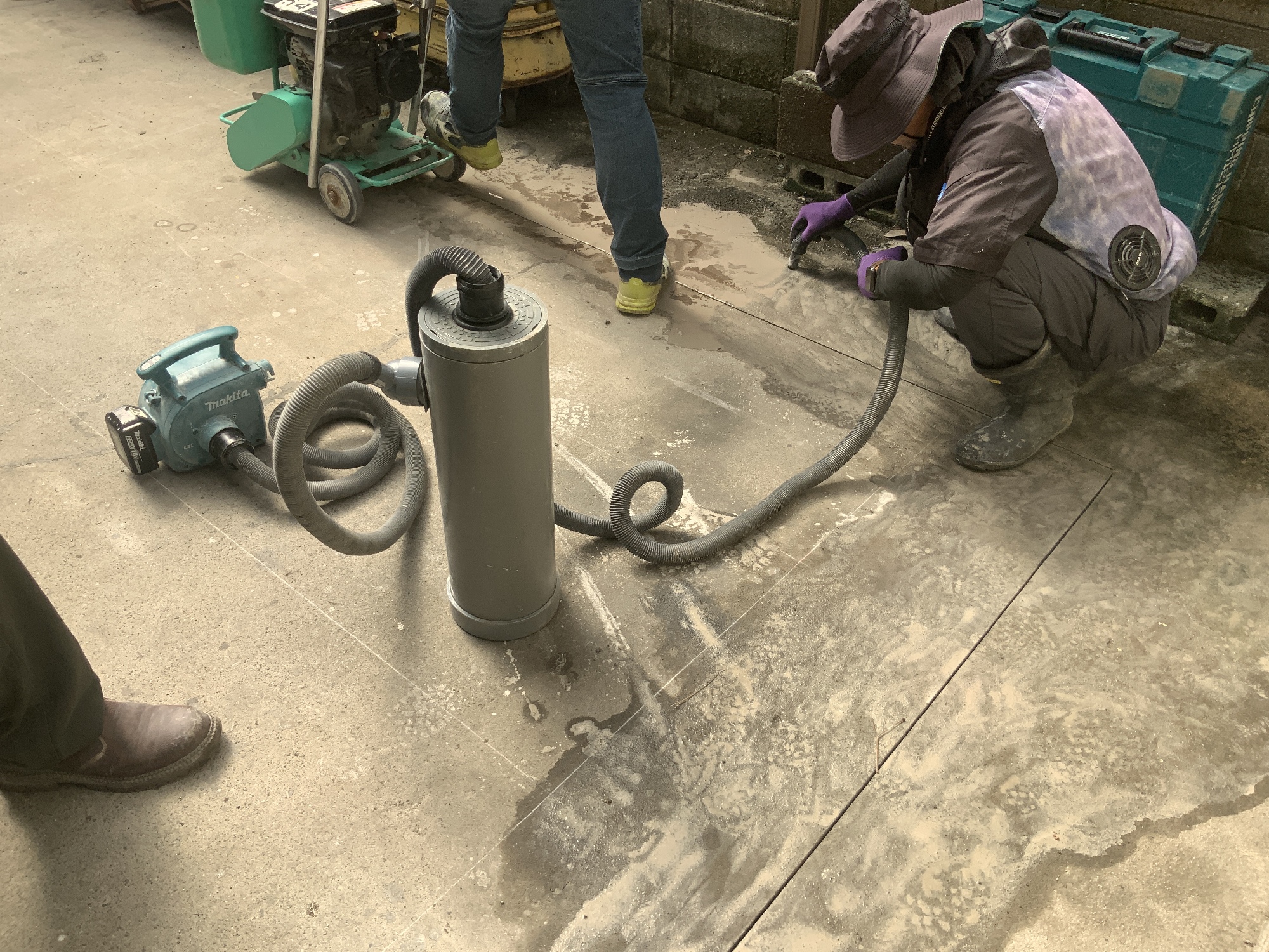 コンクリートカッターで切った後の水を小学校の運動会のために作った装置で吸い取ります