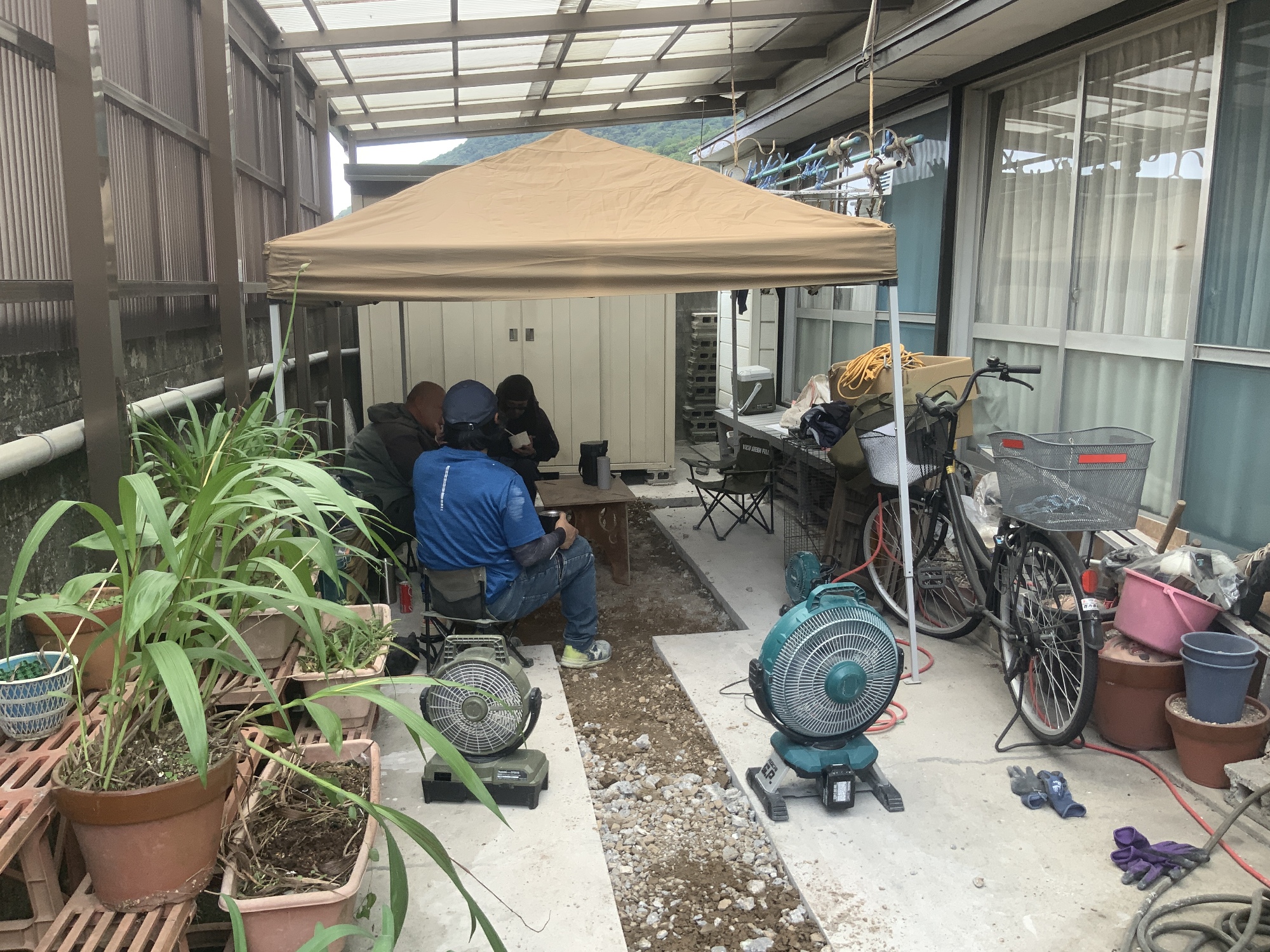 休憩はテントに扇風機3つ。冷蔵庫で飲み物冷やした飲み物を