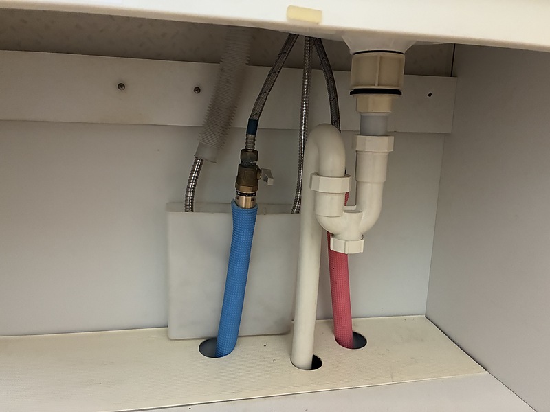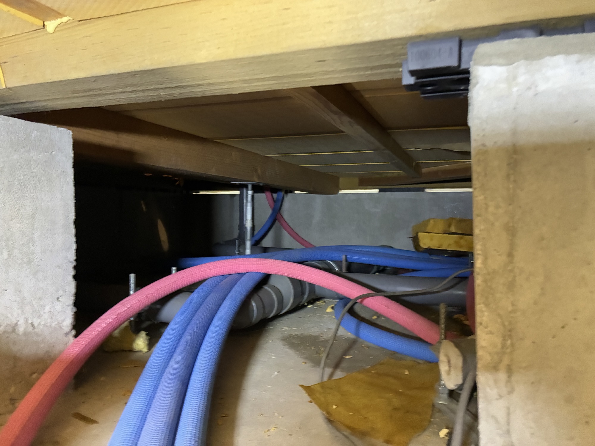 そして、いよいよ台所から洗面までの遠い道のりを床下を這って洗面の排水、給水、給湯位置を変更しに行く