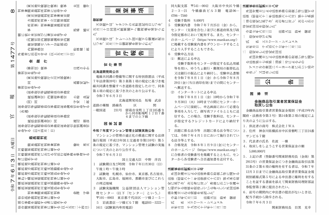 令和7年度マンション管理士試験について、官報にて公告されました。