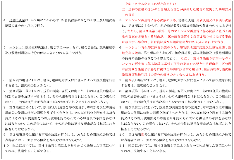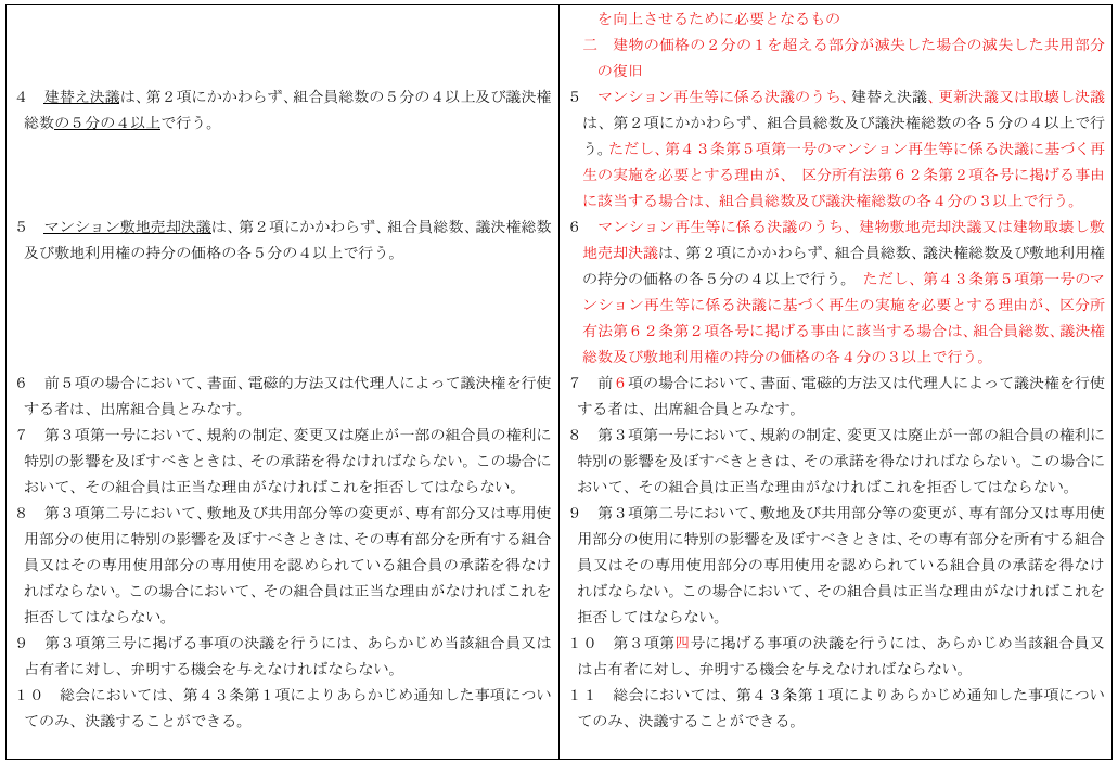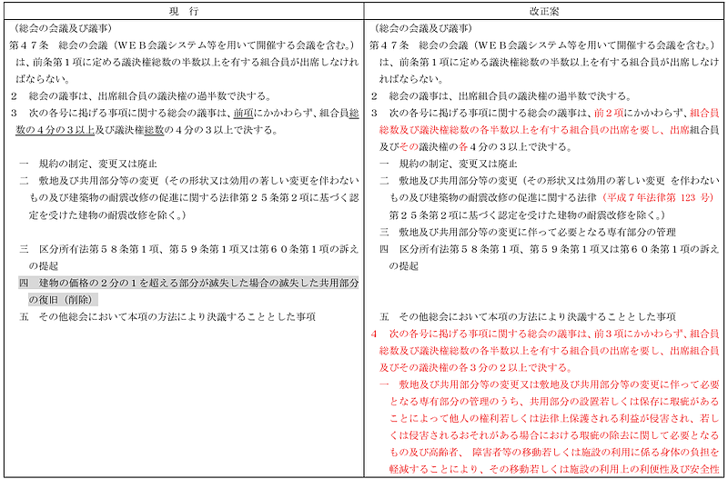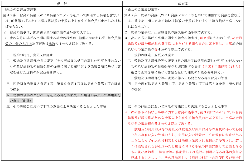 第1回「令和7年マンション関係法改正等に伴うマンション標準管理規約の見直しに関する検討会」で、一番気になる総会決議における多数決要件の見直しにつきましては、次のような素案が発表されていますのでご覧ください。