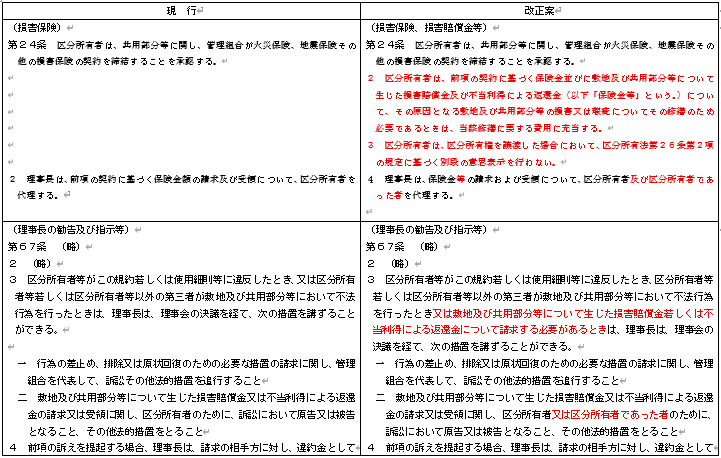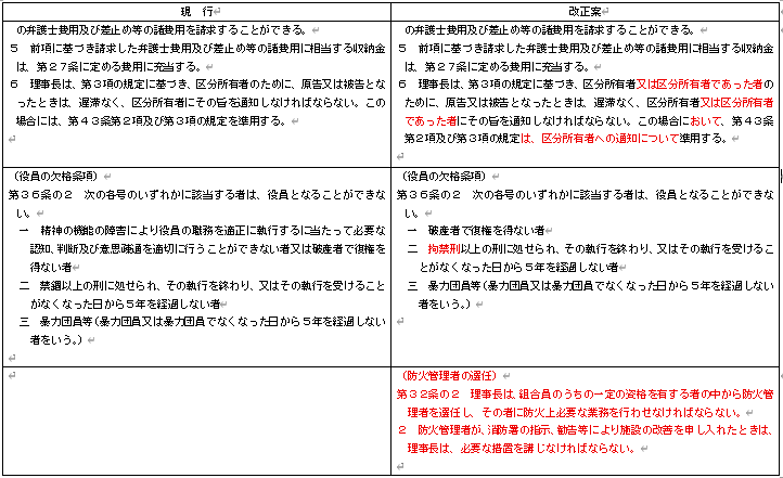 各論では、①修繕積立金の使途(第28条関連)、②共用部分等に係る損害賠償請求権の代理行使(第24条、第67条関連)、③管理組合役員に選任可能な者の範囲の見直し(第36条の2関連)、④管理組合が取り組むべき防災関係業務の内容(第32条の2新設)について、コメント内容とともに検討されています。