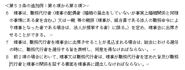 ② 一方で、理事の負担感を軽減する観点から、理事が職務代行者を定め、理事本人が理事会に出席できない場合において、その職務代行者に理事会への出席(議決権の代理行使を含む。以下同じ。)を委ねることを認めることも考えられる。この場合、職務代行者の出席を認める旨及び職務代行者として選任可能な者の範囲を規約の明文の規定で定めることが必要である。また、あらかじめ、職務代行者に定める者を理事に選任される総会又は理事に 選任された後の最初の理事会で承認を得ることで、職務代行者も 含めた形で信任を得ることが考えられる。 職務代行者の出席を認める場合の規約の例は次のとおり。