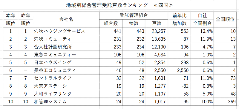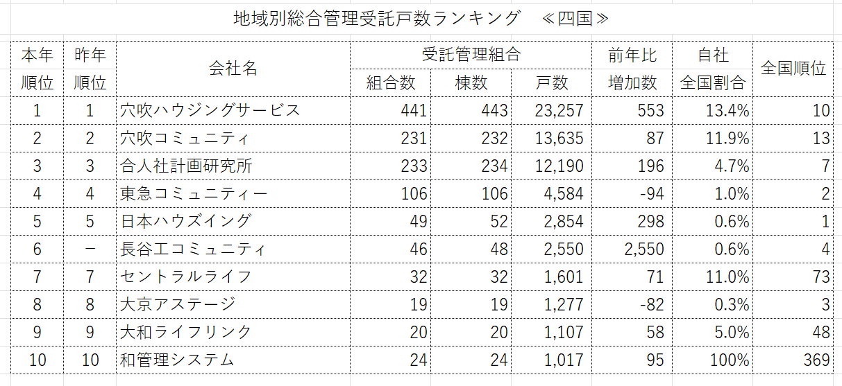 マンション管理新聞社が実施しました地域別の総合管理受託戸数調査で、四国での調査結果をお知らせしたいと思います。