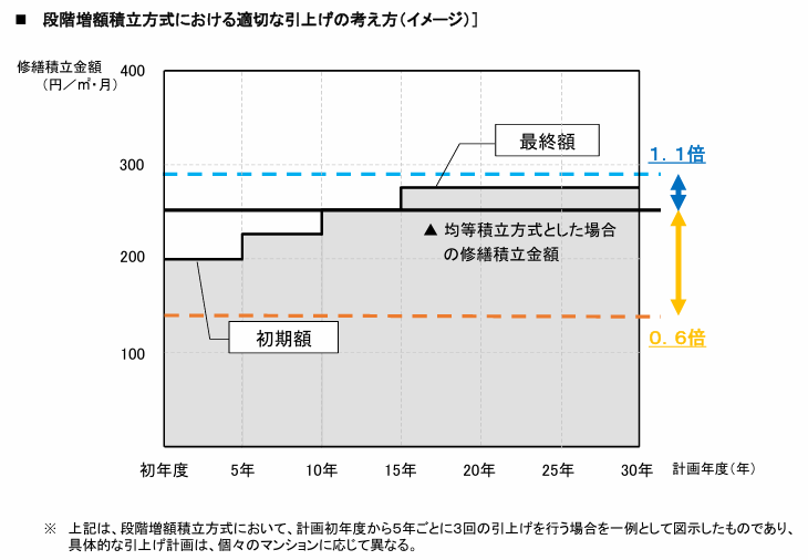 段階増額積立方式における月あたりの徴収金額は、均等積立方式とした場合の月あたりの金額を基準額とした場合、計画の初期額は基準額の0.6倍以上、計画の最終額は基準額の1.1倍以内 とする。