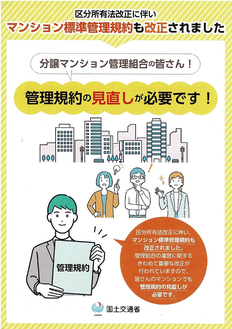 今回の区分所有法の大改正に準じて、マンション標準管理規約も大きく改正されました。国の方からも、出来る限り早めに管理規約の見直しを行って下さいとのことですので、よろしくお願いいたします。まだ、見直しがされていない場合でも、明日から施行される区分所有法の内容に抵触する管理規約の条文は無効となり、区分所有法のもとで判断されますのでご注意ください。