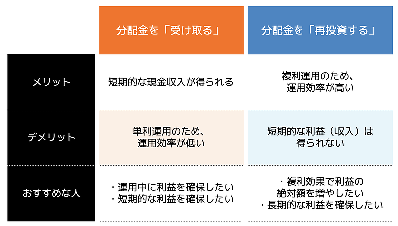 結論として、多くの個人投資家が長期的な資産形成を目指す場合、無分配型・再投資型のほうが有利とされることが多いです。