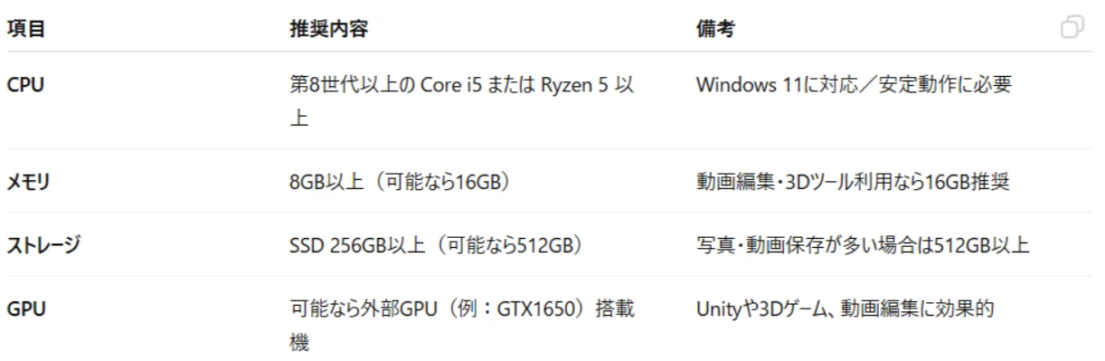 例えばScratchやブラウザ学習なら比較的スペックは控えめでもOK。