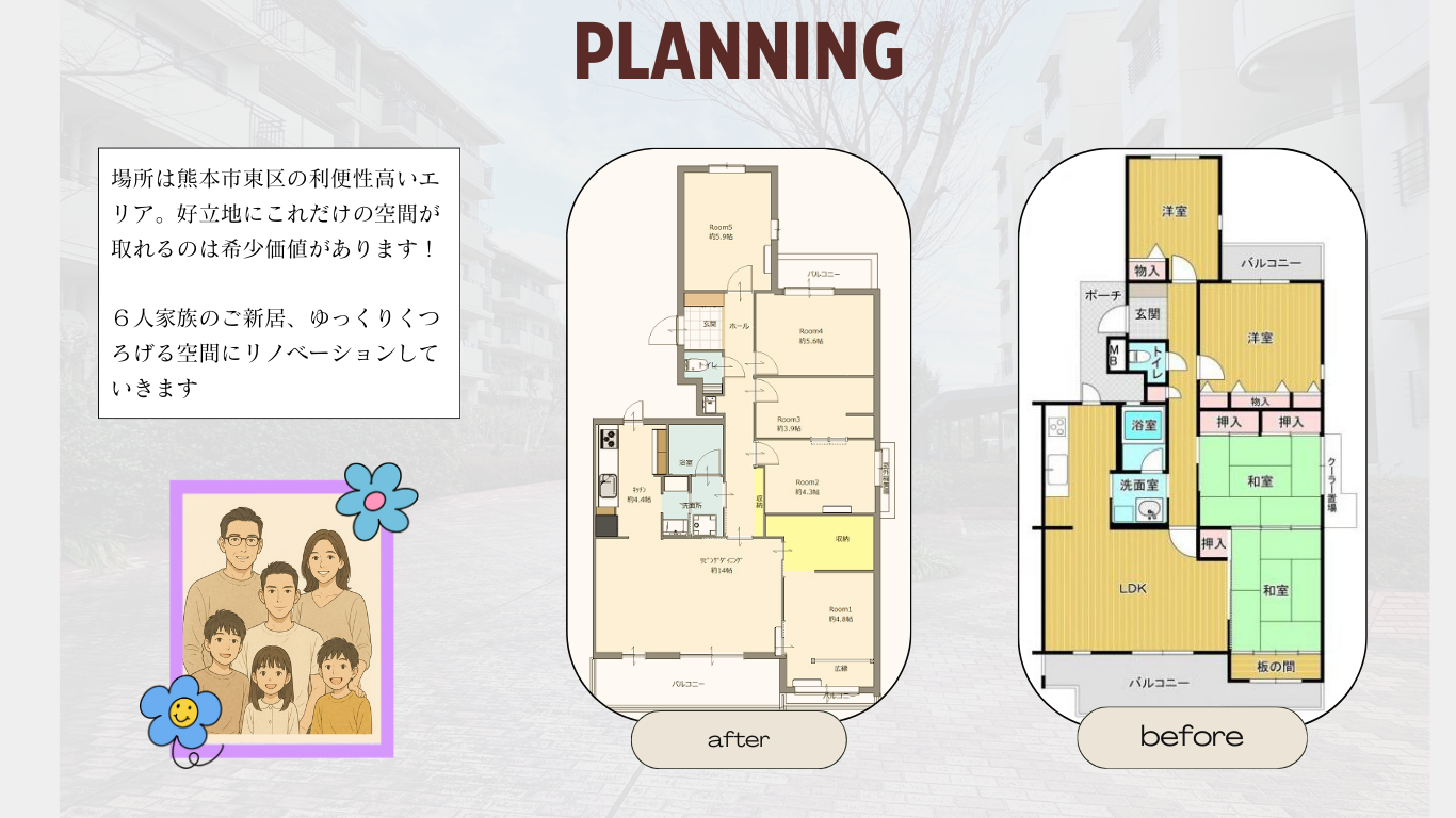 小学生のお子さんから、これから巣立ちを迎える高校生のお子さんまで、それぞれ異なるライフステージにいる家族が、成長に合わせて柔軟に使いこなせる住まいへ。家族の未来を見据えたリノベーションが、いよいよ始まります。